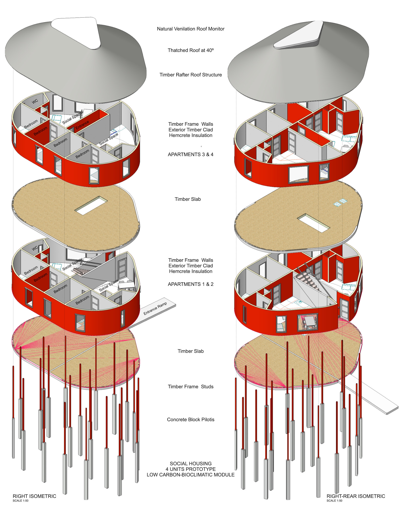 Las unidades habitacionales agrupan cuatro viviendas en dos pisos, una configuración elegida para mantener los sistemas estructurales simples y los costos de construcción dentro del rango de los precios de lotes urbanos en la zona. La huella del edificio es ovalada, una geometría que maximiza el espacio verde entre edificios y fomenta la interacción a lo largo del perímetro en lugar de aislar las unidades detrás de muros. La construcción ligera en madera y palma — materiales locales y renovables — permite edificios de dos pisos y medio en lotes que la construcción convencional de concreto haría económicamente inviables.