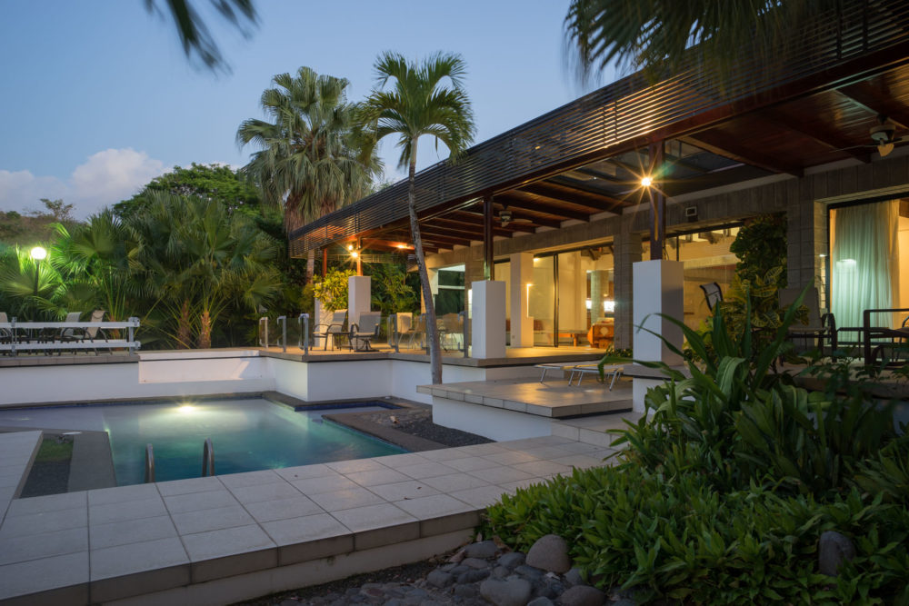 La luz del oeste ingresa tamizada por celosías de madera, un recurso de la arquitectura vernácula costarricense reinterpretado aquí en un lenguaje tropical contemporáneo. La madera contrasta con la piedra y las superficies pintadas, y contribuye al compromiso del proyecto con materiales renovables de baja huella de carbono.