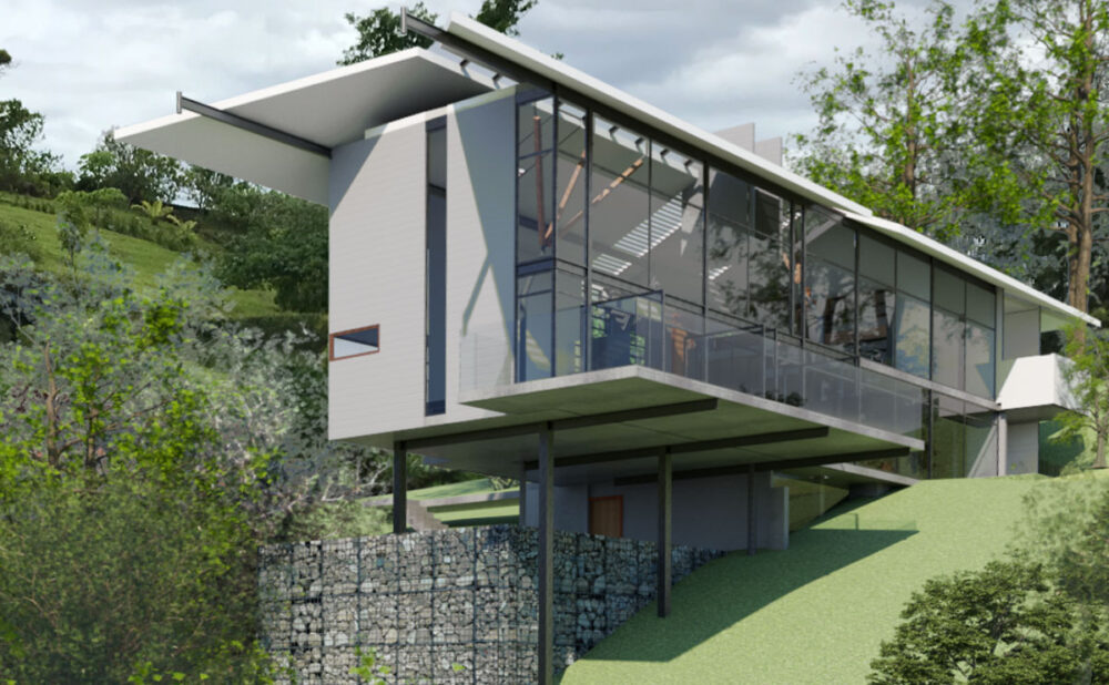 Casa Arias se concibe como una residencia ligera y elevada que se adapta a un terreno empinado, manteniendo un contacto visual continuo con el dosel del bosque circundante. El proyecto se organiza como un ala lineal suspendida sobre la ladera, soportada por una combinación de muros de contención de gaviones y esbeltas columnas de acero que minimizan el impacto en el suelo.