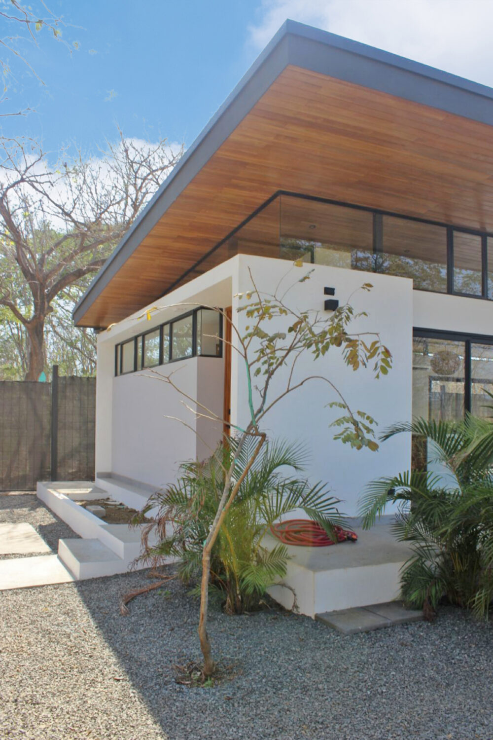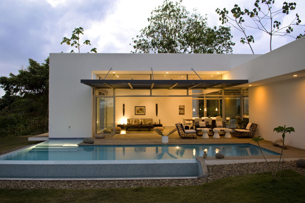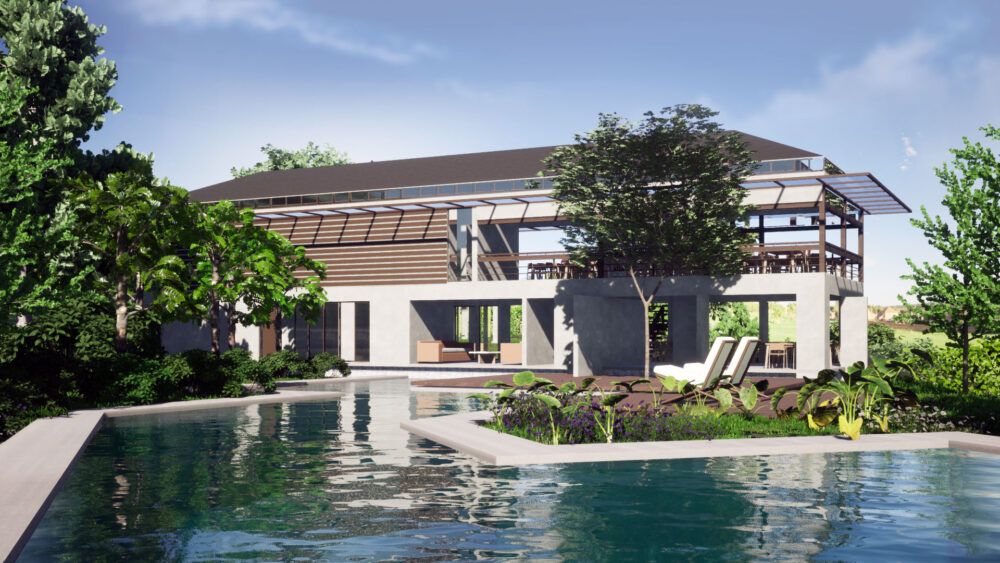 En el diseño destaca un voladizo expansivo, un escudo contra el sol fuerte y la lluvia estacional. Este elemento arquitectónico no solo refuerza la comodidad, sino que también se integra a la perfección con la estética general.