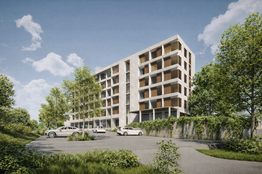 Lo que distingue a este proyecto es su fachada. Una estructura limpia de dos pisos con una forma cuadrada audaz está adornada con una perforación significativa revestida de madera y vidrio. Esta característica arquitectónica no solo agrega interés visual, sino que también permite que la luz natural fluya hacia los apartamentos, mejorando su atractivo.