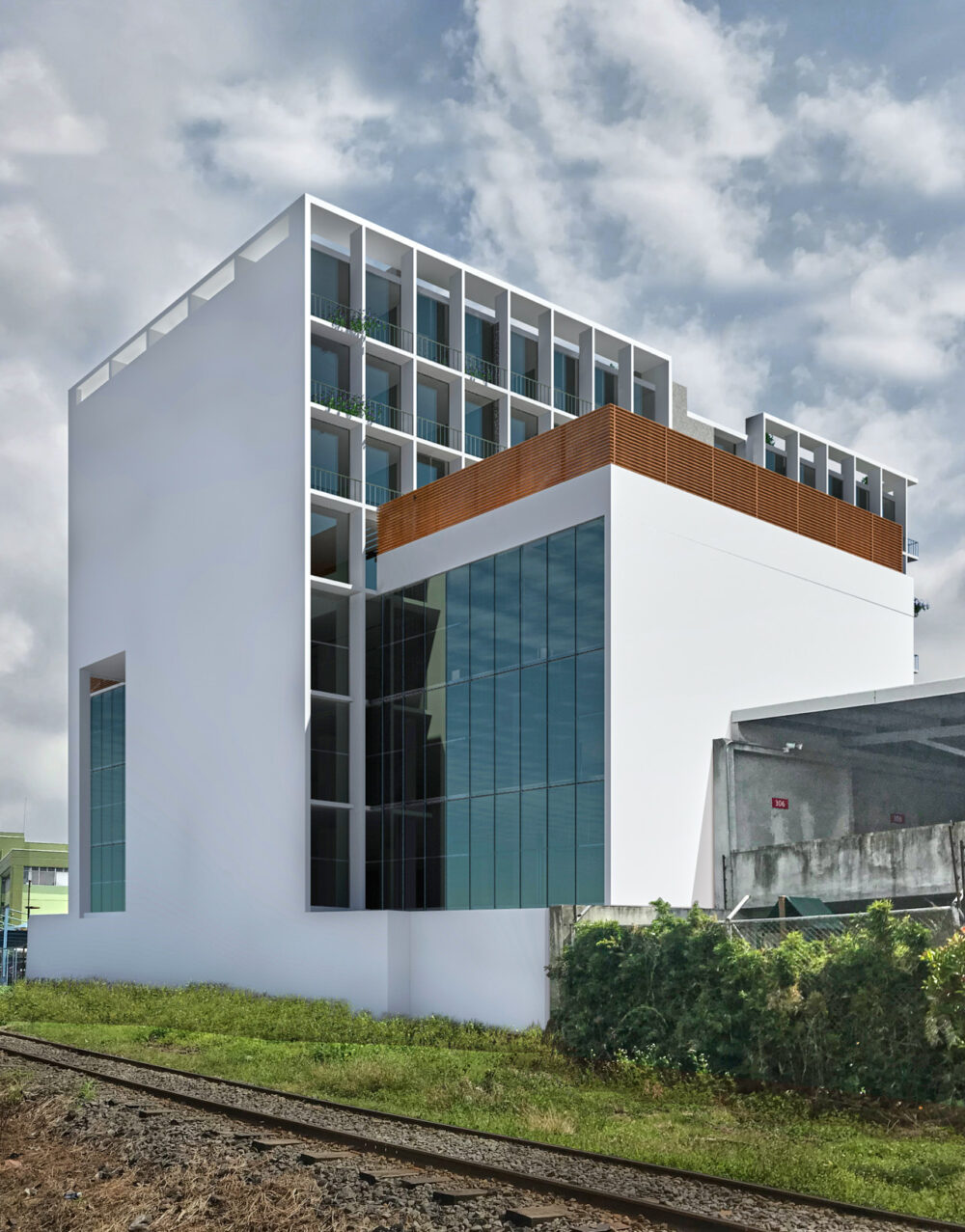 La fachada consta de una cuadrícula de estuco beige, acentuada con paneles de madera y vidrio a cuadros con respaldo sentado, y esquinas redondeadas, que simbolizan una armonía de eficiencia y gracia.