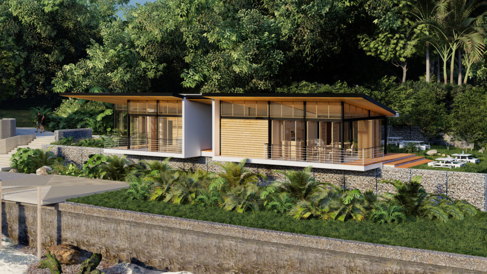 Los edificios utilizan un sistema estructural de acero prefabricado combinado con cubiertas de madera local y revestimiento de paredes, equilibrando la eficiencia constructiva con un carácter cálido de materiales regionales. El lenguaje arquitectónico se inspira en las tradiciones vernáculas del Caribe a través de protecciones de ventanas, balaustradas ligeras y una envolvente permeable que promueve la ventilación natural, la sombra y una estrecha relación con el bosque circundante.