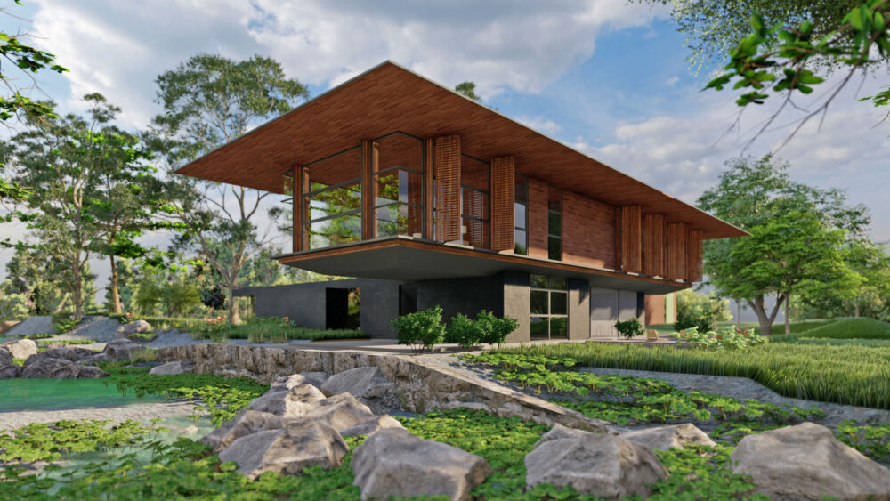 El diseño toma el caño existente y los árboles maduros del sitio como punto de partida, organizando el edificio alrededor de estos elementos naturales en lugar de desplazarlos. Las estrategias biofílicas rigen la distribución espacial, manteniendo la vegetación, el agua y la luz natural como elementos centrales de la experiencia de cada espacio. El diseño bioclimático para el clima tropical — ventilación cruzada, sombreamiento y masa térmica — reduce el consumo energético mientras mantiene el confort sin depender del enfriamiento mecánico.