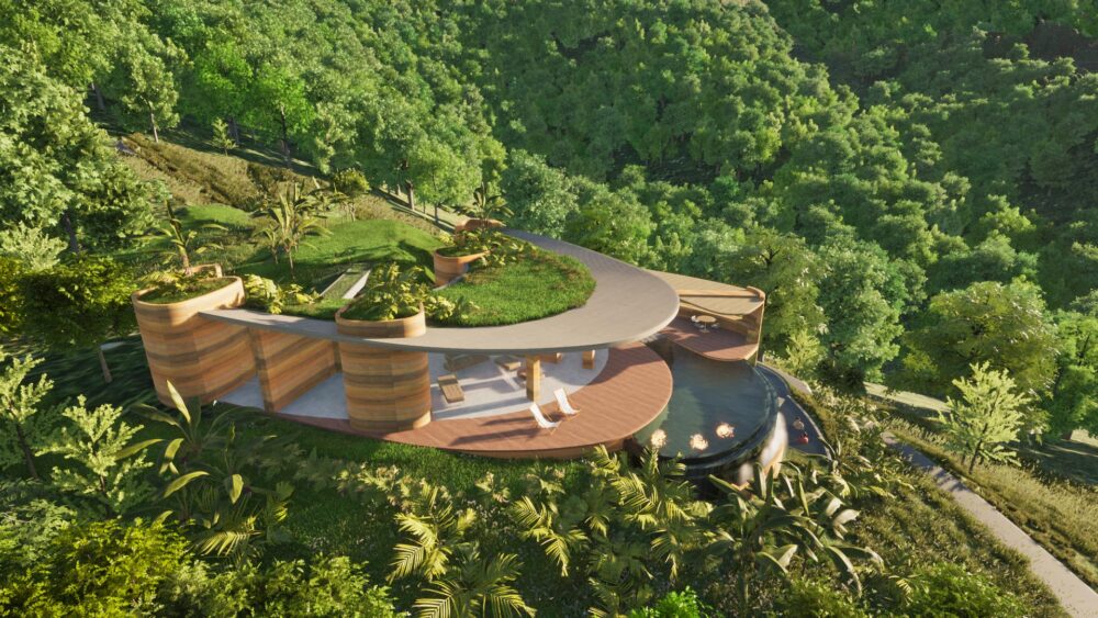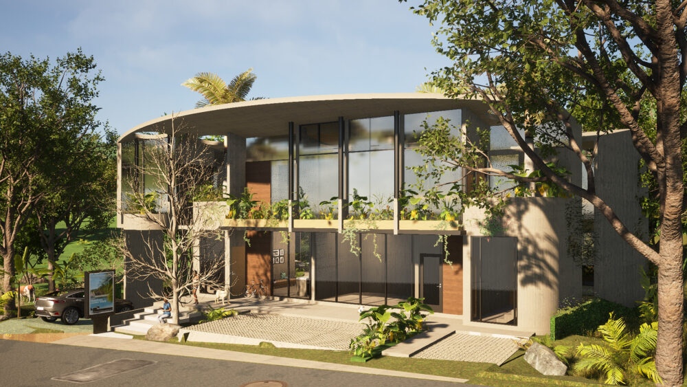 El espíritu del diseño se alinea con la visión del cliente de estrategias sostenibles y regenerativas, entretejidas orgánicamente en la arquitectura tropical. Las características clave del proyecto incluyen un techo verde, que ayuda en la eficiencia energética y la regulación térmica, un río lento y una piscina infinita, que combina sin esfuerzo el entorno construido con la generosidad de la naturaleza. Los muros de tierra apisonada no solo garantizan una construcción sostenible, sino que también mejoran el valor estético de las casas, proporcionando un contraste terrenal con el bosque circundante y las vistas al océano.