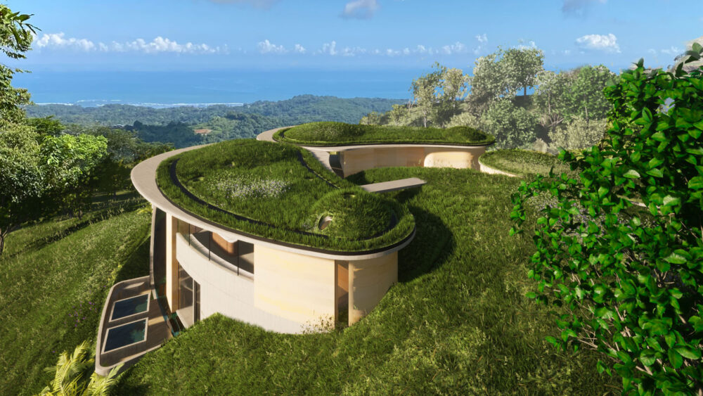 El diseño incorpora las estrategias sostenibles y regenerativas promovidas por el cliente dentro de una arquitectura orgánica y tropical. Techo verde, río lento, piscina infinita, paredes de tierra apisonada, vistas al bosque y al mar