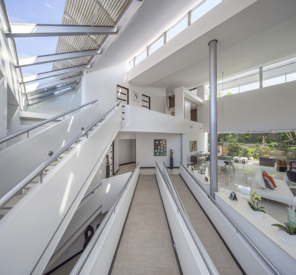 El volumen frontal alberga el programa privado. Se separa de los espacios sociales mediante una secuencia de muros diagonales que forman una fachada interna, iluminada desde arriba por un gran lucernario de vidrio sobre la rampa — un atrio que introduce la luz del día al corazón de la casa. Las paredes blancas y lisas se tratan como campos proporcionales, cada una calibrada para organizar las grandes aperturas rectangulares que alternan de posición de ambiente en ambiente — una aplicación directa de la investigación de Beer sobre el campo geométrico intuitivo, aquí traducida a la sección doméstica. Las paredes sirven también como superficie principal para la colección de arte costarricense de la pareja, principalmente la obra pictórica de Margarita Fuscaldo. La excepción es el muro del jardín, que flota libre del piso y del techo — la única superficie sin arte, que otorga al espacio una sensación de ligereza en su extremo. Donde el control bioclimático o la protección de las obras lo requiere, lamas horizontales filtran la luz a través de los grandes ventanales sin interrumpir las visuales entre espacios.