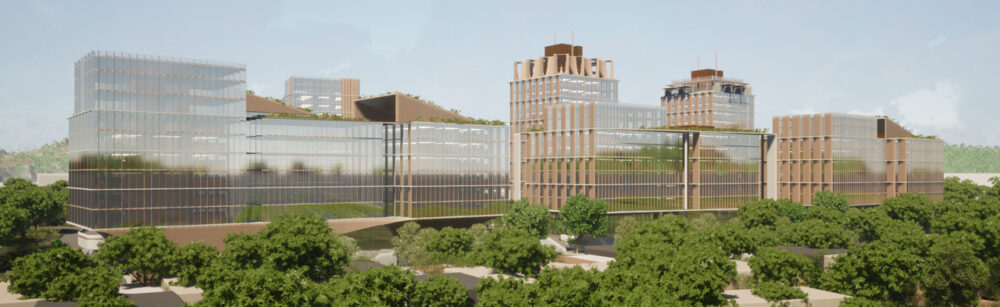 Los edificios se giran respecto a la trama urbana para colocar las fachadas vidriadas en orientación norte-sur óptima, resolviendo la iluminación natural en las difíciles exposiciones este y oeste, mientras crean ritmo y porosidad a lo largo de los bordes de calle. Techos verdes, paneles solares, superficies permeables y particiones de madera laminada reducen la carga térmica y ambiental de lo que de otro modo sería una isla de concreto en medio de la ciudad.