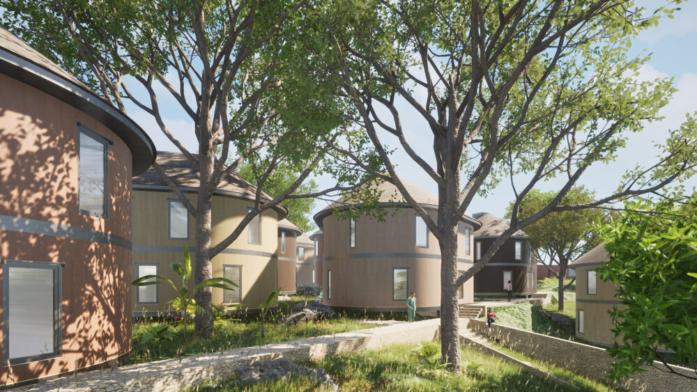 Las unidades habitacionales agrupan cuatro viviendas en dos pisos, una configuración elegida para mantener los sistemas estructurales simples y los costos de construcción dentro del rango de los precios de lotes urbanos en la zona. La huella del edificio es ovalada, una geometría que maximiza el espacio verde entre edificios y fomenta la interacción a lo largo del perímetro en lugar de aislar las unidades detrás de muros. La construcción ligera en madera y palma — materiales locales y renovables — permite edificios de dos pisos y medio en lotes que la construcción convencional de concreto haría económicamente inviables.