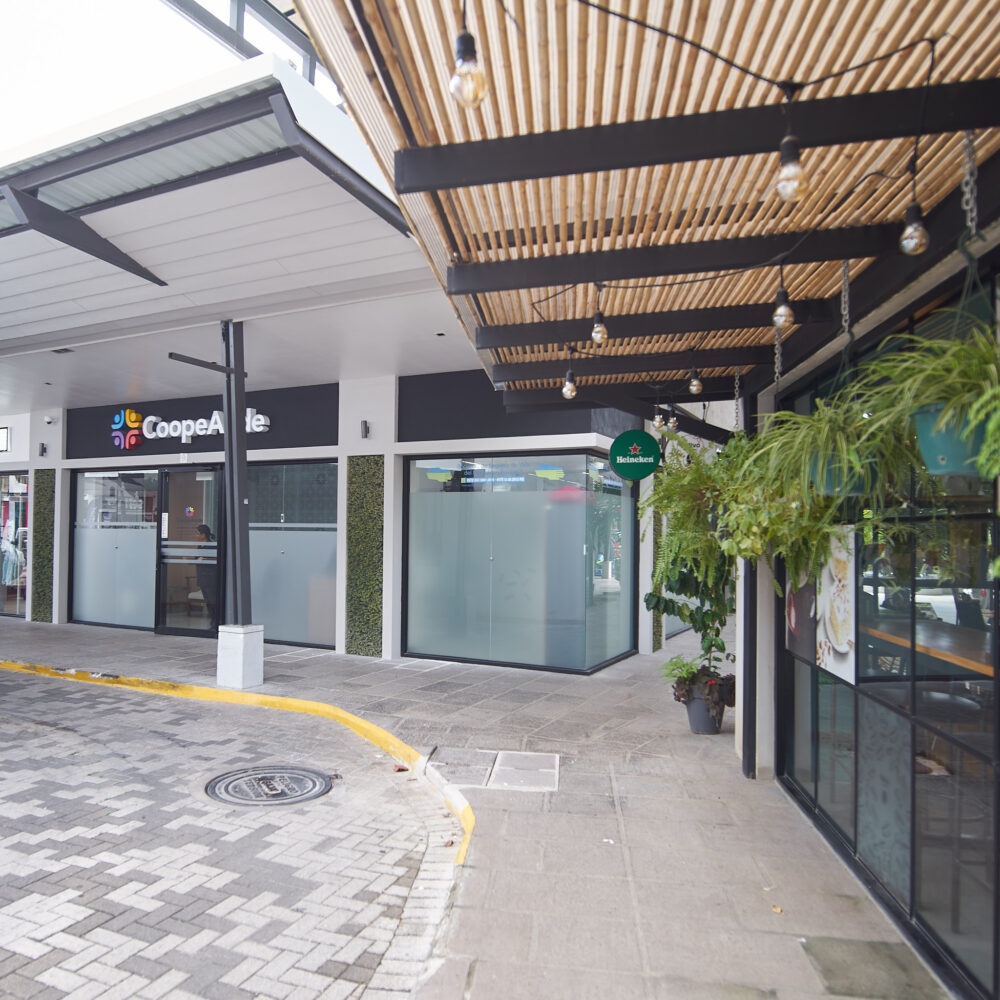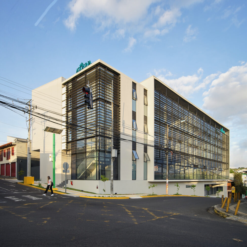 El Edificio Asouna ocupa una esquina estratégica en el ingreso a los cuadrantes de Heredia, construido para la asociación solidarista de empleados de la Universidad Nacional. El programa se distribuye en cuatro niveles: locales comerciales en planta baja que refuerzan la continuidad peatonal de la calle, oficinas corporativas en los pisos intermedios, y un piso de bienestar —gimnasio, consultorio dental, spa— en la parte superior, orientado hacia las vistas de la montaña. El estacionamiento se resuelve en sótano y en el interior del cuadrante, preservando la escala peatonal del entorno.