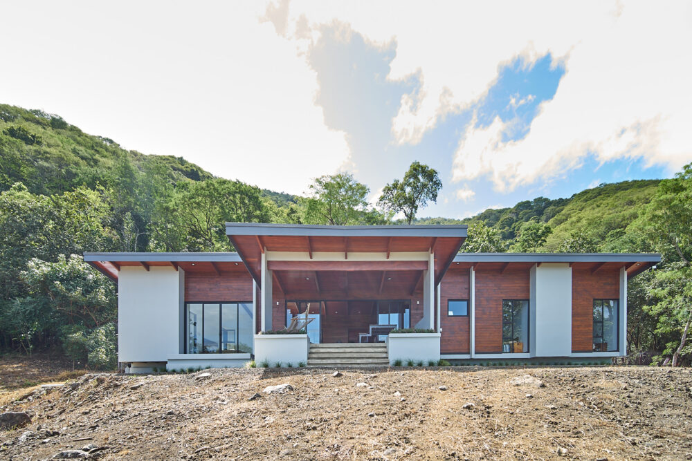 La planta lineal abre las fachadas principales hacia vistas despejadas del Valle de Nicoya y el Cerro Caballito. Las grandes aperturas están posicionadas y dimensionadas para enmarcar estas vistas mientras mantienen suficiente sombra para conservar el interior confortable durante los meses más calurosos. La madera se extiende desde la estructura hasta las particiones y el cerramiento — un material que es a la vez sistema constructivo, acabado y experiencia espacial principal de la vivienda.